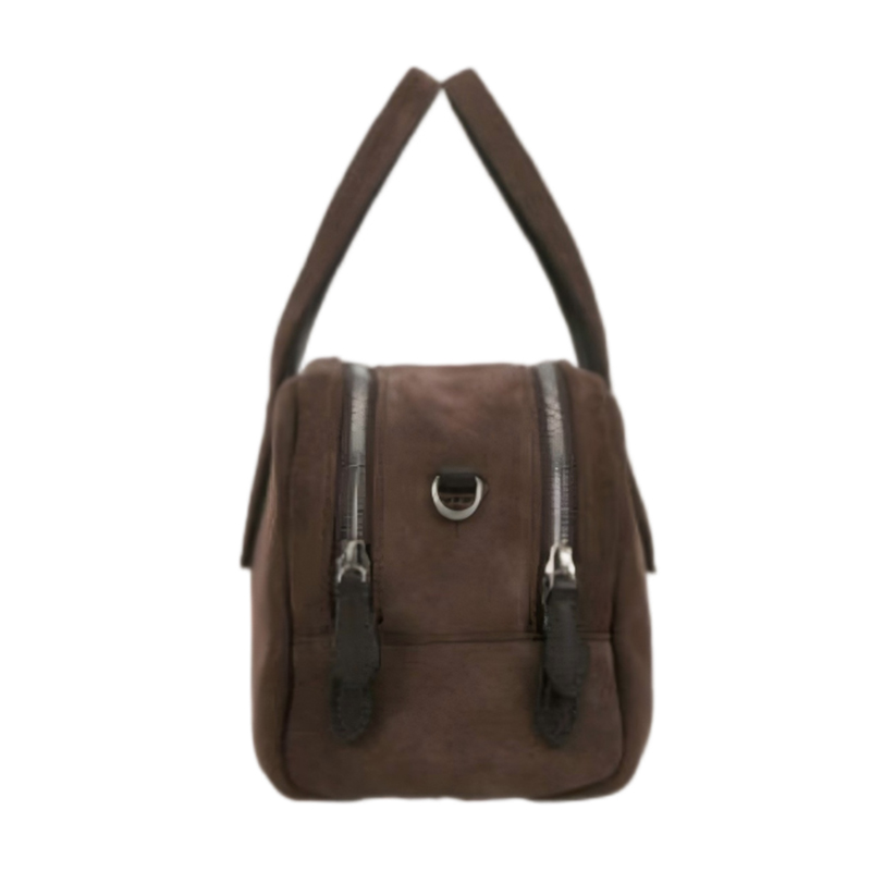 1.21 lbCrafted from soft brown suede, this handbag features a structured bowling bag design with two separate compartments, allowing for easy organization of your essentials. The sleek suede handles are integrated seamlessly with the body of the bag, while the leather shoulder strap offers an added option for a hands-free carry. When not in use, the leather strap can be detached, turning this functional piece into a refined hand-held tote.