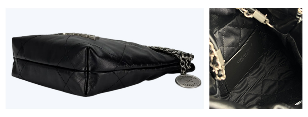 - Chanel 22 Shopping Bag is crafted from lambskin, offering plump, durable leather with a fine texture. The body is soft yet maintains a structured, elegant shape. The interior features a leather and cotton blend, enhancing wear resistance. The hardware is finished with Chanel’s proprietary thick gold matte plating, which is scratch-resistant and anti-oxidation.