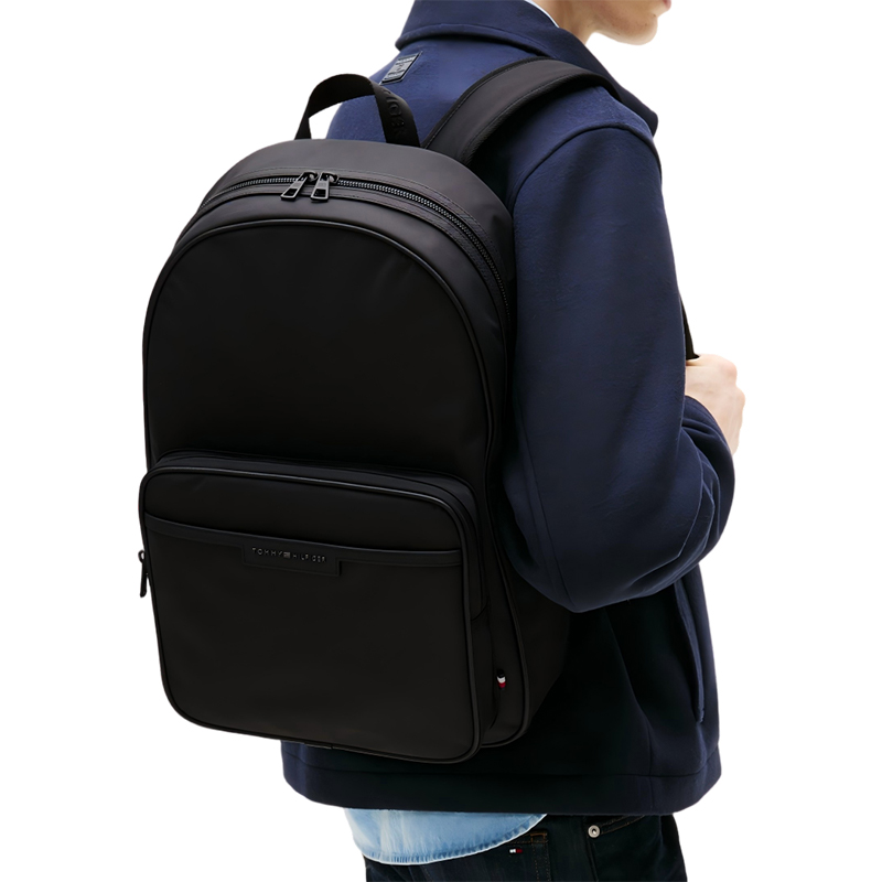 This sleek black backpack features a structured dome-shaped top, offering a clean and modern silhouette. Designed as a brand-customized style, it balances minimal aesthetics with practical functionality, making it an ideal bag for men in both business and casual settings.