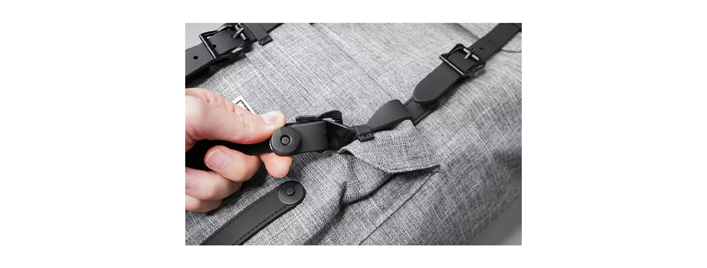 The magnetic belt buckle of the Herschel Little America Backpack.