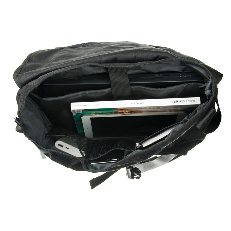 Additional storage is thoughtfully integrated throughout. The front panel includes both a vertical zip pocket and a slip pocket for quick-access items. Inside the main compartment, one side features three mesh slip pockets for organized storage. On the opposite side, a cleverly folded construction allows the 15.6” laptop compartment to lie flat against the bag when not in use, preserving maximum interior space. A small zippered pocket is added onto the laptop sleeve for accessories, making this a highly practical laptop messenger bag for students and commuters.