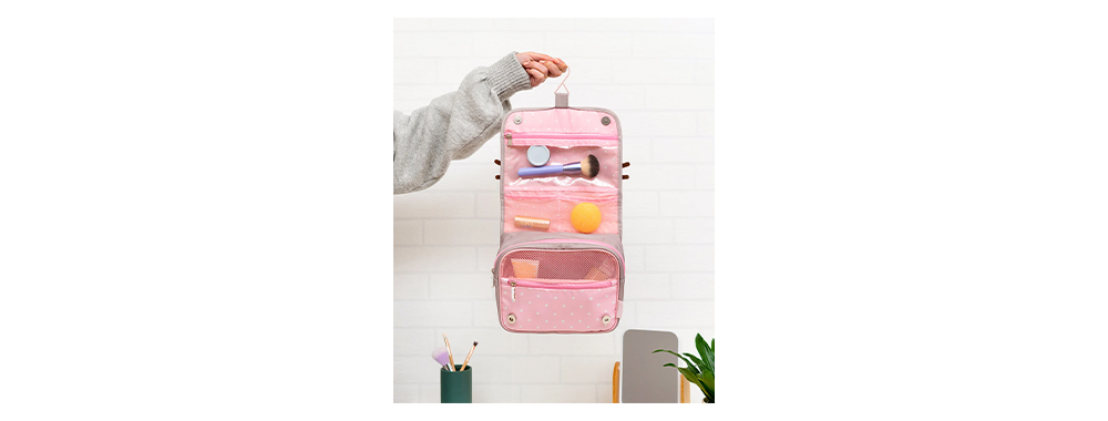 Las encimeras de los baños de hotel tienen una superficie media inferior a 0,5 metros cuadrados. Nuestro neceser colgante con gancho metálico giratorio de 360° convierte el espacio vertical en un lugar de almacenamiento organizado.